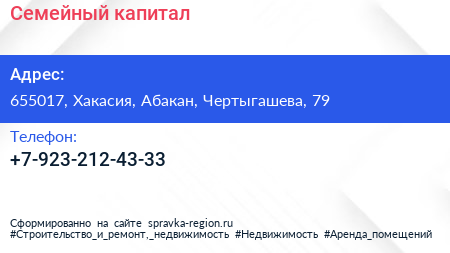 Семейный капитал по адресу 655017, Хакасия, Абакан, Чертыгашева, 79 в дальнейшем Организация, размещена в следующих категориях: