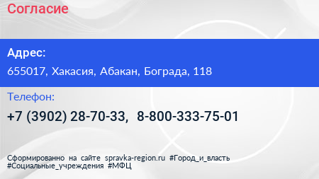 Согласие по адресу 655017, Хакасия, Абакан, Бограда, 118 в дальнейшем Организация, размещена в следующих категориях: