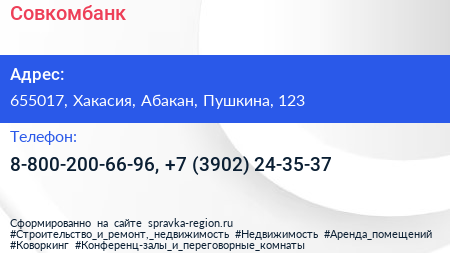Совкомбанк по адресу 655017, Хакасия, Абакан, Пушкина, 123 в дальнейшем Организация, размещена в следующих категориях: