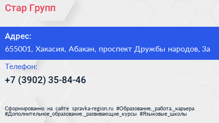 Стар Групп по адресу 655001, Хакасия, Абакан, проспект Дружбы народов, 3а в дальнейшем Организация, размещена в следующих категориях: