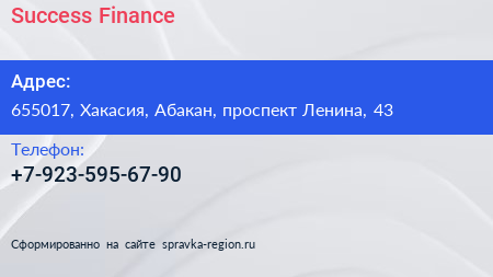 Success Finance по адресу 655017, Хакасия, Абакан, проспект Ленина, 43 в дальнейшем Организация, размещена в следующих категориях: