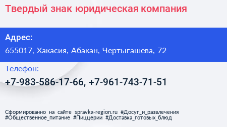 Твердый знак, юридическая компания по адресу 655017, Хакасия, Абакан, Чертыгашева, 72 в дальнейшем Организация, размещена в следующих категориях: