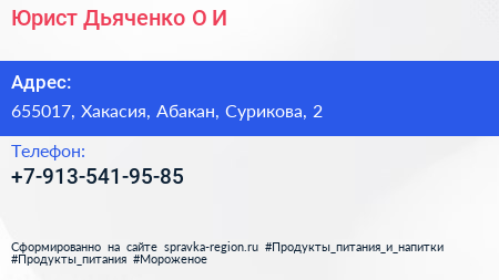 Юрист Дьяченко О.И. по адресу 655017, Хакасия, Абакан, Сурикова, 2 в дальнейшем Организация, размещена в следующих категориях:
