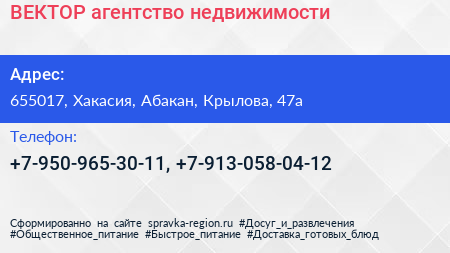 ВЕКТОР, агентство недвижимости по адресу 655017, Хакасия, Абакан, Крылова, 47а в дальнейшем Организация, размещена в следующих категориях: