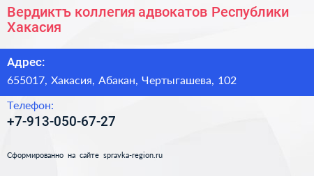 Вердиктъ, коллегия адвокатов Республики Хакасия по адресу 655017, Хакасия, Абакан, Чертыгашева, 102 в дальнейшем Организация, размещена в следующих категориях: