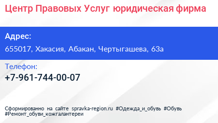 Центр Правовых Услуг, юридическая фирма по адресу 655017, Хакасия, Абакан, Чертыгашева, 63а в дальнейшем Организация, размещена в следующих категориях: