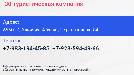 +30, туристическая компания по адресу 655017, Хакасия, Абакан, Чертыгашева, 84 в дальнейшем Организация, размещена в следующих категориях: