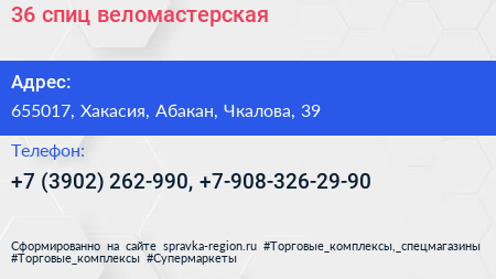36 спиц, веломастерская по адресу 655017, Хакасия, Абакан, Чкалова, 39 в дальнейшем Организация, размещена в следующих категориях: