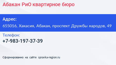 Абакан РиО, квартирное бюро по адресу 655016, Хакасия, Абакан, проспект Дружбы народов, 49 в дальнейшем Организация, размещена в следующих категориях: