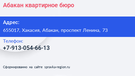 Абакан, квартирное бюро по адресу 655017, Хакасия, Абакан, проспект Ленина, 73 в дальнейшем Организация, размещена в следующих категориях: