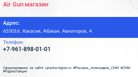 Air Gun, магазин по адресу 655016, Хакасия, Абакан, Авиаторов, 4 в дальнейшем Организация, размещена в следующих категориях: