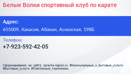 Белые Волки, спортивный клуб по карате по адресу 655009, Хакасия, Абакан, Аскизская, 198Б в дальнейшем Организация, размещена в следующих категориях: