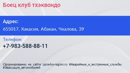 Боец, клуб тхэквондо по адресу 655017, Хакасия, Абакан, Чкалова, 39 в дальнейшем Организация, размещена в следующих категориях: