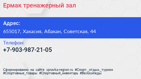 Ермак, тренажерный зал по адресу 655017, Хакасия, Абакан, Советская, 44 в дальнейшем Организация, размещена в следующих категориях: