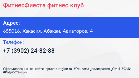 ФитнесФиеста, фитнес-клуб по адресу 655016, Хакасия, Абакан, Авиаторов, 4 в дальнейшем Организация, размещена в следующих категориях: