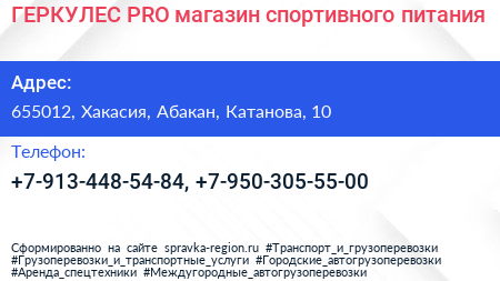 ГЕРКУЛЕС PRO, магазин спортивного питания по адресу 655012, Хакасия, Абакан, Катанова, 10 в дальнейшем Организация, размещена в следующих категориях: