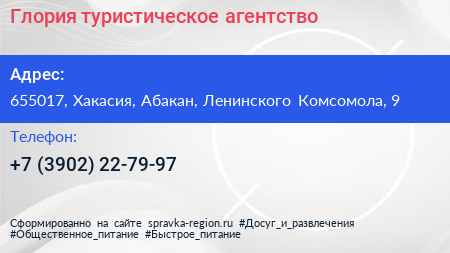 Глория, туристическое агентство по адресу 655017, Хакасия, Абакан, Ленинского Комсомола, 9 в дальнейшем Организация, размещена в следующих категориях:
