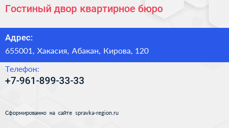 Гостиный двор, квартирное бюро по адресу 655001, Хакасия, Абакан, Кирова, 120 в дальнейшем Организация, размещена в следующих категориях: