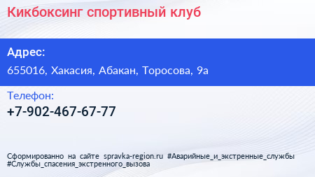 Кикбоксинг, спортивный клуб по адресу 655016, Хакасия, Абакан, Торосова, 9а в дальнейшем Организация, размещена в следующих категориях: