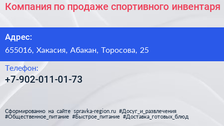 Компания по продаже спортивного инвентаря по адресу 655016, Хакасия, Абакан, Торосова, 25 в дальнейшем Организация, размещена в следующих категориях: