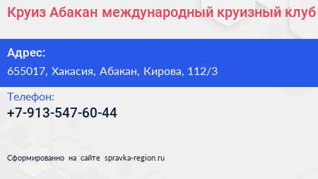 Круиз-Абакан, международный круизный клуб по адресу 655017, Хакасия, Абакан, Кирова, 112/3 в дальнейшем Организация, размещена в следующих категориях: