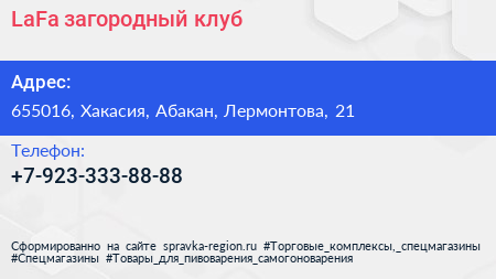LaFa, загородный клуб по адресу 655016, Хакасия, Абакан, Лермонтова, 21 в дальнейшем Организация, размещена в следующих категориях:
