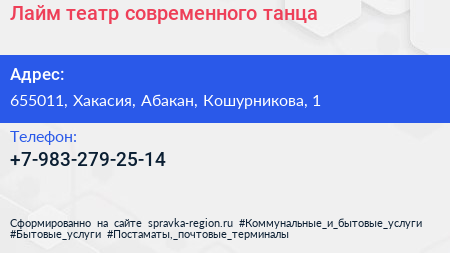 Лайм, театр современного танца по адресу 655011, Хакасия, Абакан, Кошурникова, 1 в дальнейшем Организация, размещена в следующих категориях: