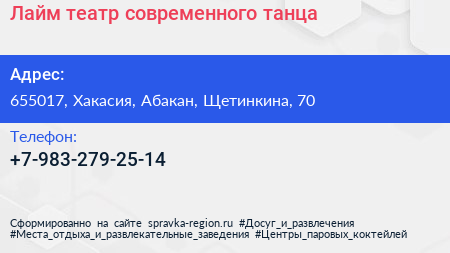 Лайм, театр современного танца по адресу 655017, Хакасия, Абакан, Щетинкина, 70 в дальнейшем Организация, размещена в следующих категориях:
