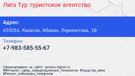 Лига-Тур, туристское агентство по адресу 655016, Хакасия, Абакан, Лермонтова, 18 в дальнейшем Организация, размещена в следующих категориях: