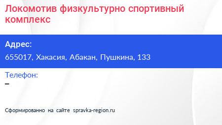Локомотив, физкультурно-спортивный комплекс по адресу 655017, Хакасия, Абакан, Пушкина, 133 в дальнейшем Организация, размещена в следующих категориях: