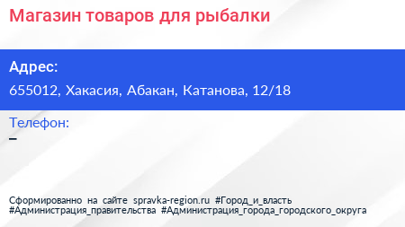 Магазин товаров для рыбалки по адресу 655012, Хакасия, Абакан, Катанова, 12/18 в дальнейшем Организация, размещена в следующих категориях: