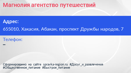 Магнолия, агентство путешествий по адресу 655010, Хакасия, Абакан, проспект Дружбы народов, 7 в дальнейшем Организация, размещена в следующих категориях: