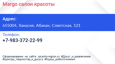 Margo, салон красоты по адресу 655004, Хакасия, Абакан, Советская, 121 в дальнейшем Организация, размещена в следующих категориях: