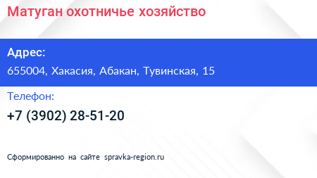 Матуган, охотничье хозяйство по адресу 655004, Хакасия, Абакан, Тувинская, 15 в дальнейшем Организация, размещена в следующих категориях: