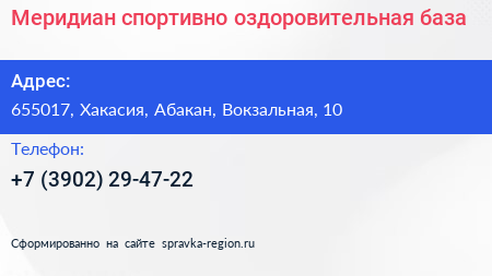 Меридиан, спортивно-оздоровительная база по адресу 655017, Хакасия, Абакан, Вокзальная, 10 в дальнейшем Организация, размещена в следующих категориях:
