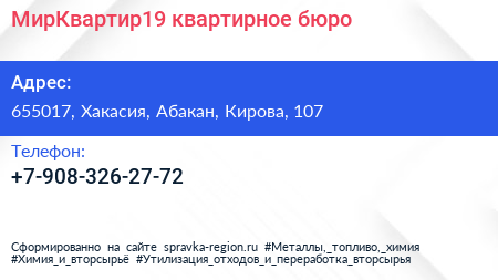 МирКвартир19, квартирное бюро по адресу 655017, Хакасия, Абакан, Кирова, 107 в дальнейшем Организация, размещена в следующих категориях: