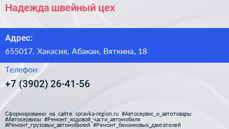 Надежда, швейный цех по адресу 655017, Хакасия, Абакан, Вяткина, 18 в дальнейшем Организация, размещена в следующих категориях: