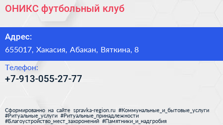ОНИКС, футбольный клуб по адресу 655017, Хакасия, Абакан, Вяткина, 8 в дальнейшем Организация, размещена в следующих категориях: