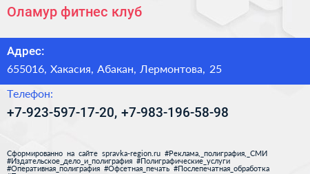 Оламур, фитнес-клуб по адресу 655016, Хакасия, Абакан, Лермонтова, 25 в дальнейшем Организация, размещена в следующих категориях: