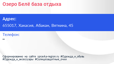 Озеро Белё, база отдыха по адресу 655017, Хакасия, Абакан, Вяткина, 45 в дальнейшем Организация, размещена в следующих категориях: