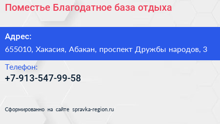 Поместье Благодатное, база отдыха по адресу 655010, Хакасия, Абакан, проспект Дружбы народов, 3 в дальнейшем Организация, размещена в следующих категориях: