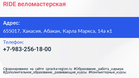 RIDE, веломастерская по адресу 655017, Хакасия, Абакан, Карла Маркса, 14а к1 в дальнейшем Организация, размещена в следующих категориях: