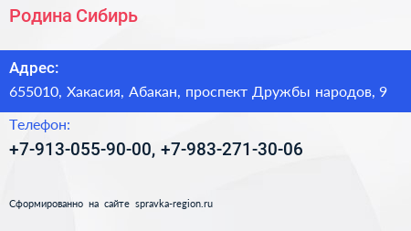Родина-Сибирь по адресу 655010, Хакасия, Абакан, проспект Дружбы народов, 9 в дальнейшем Организация, размещена в следующих категориях: