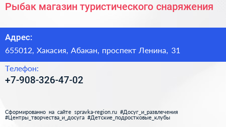 Рыбак, магазин туристического снаряжения по адресу 655012, Хакасия, Абакан, проспект Ленина, 31 в дальнейшем Организация, размещена в следующих категориях: