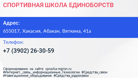 СПОРТИВНАЯ ШКОЛА ЕДИНОБОРСТВ по адресу 655017, Хакасия, Абакан, Вяткина, 41а в дальнейшем Организация, размещена в следующих категориях: