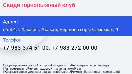 Скади, горнолыжный клуб по адресу 655015, Хакасия, Абакан, Вершина горы Самохвал, 1 в дальнейшем Организация, размещена в следующих категориях: