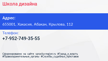 Школа дизайна по адресу 655001, Хакасия, Абакан, Крылова, 112 в дальнейшем Организация, размещена в следующих категориях: