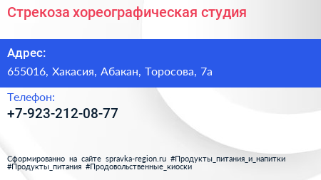 Стрекоза, хореографическая студия по адресу 655016, Хакасия, Абакан, Торосова, 7а в дальнейшем Организация, размещена в следующих категориях: