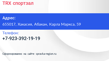 TRX, спортзал по адресу 655017, Хакасия, Абакан, Карла Маркса, 59 в дальнейшем Организация, размещена в следующих категориях: