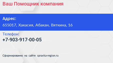 Ваш Помощник, компания по адресу 655017, Хакасия, Абакан, Вяткина, 16 в дальнейшем Организация, размещена в следующих категориях: